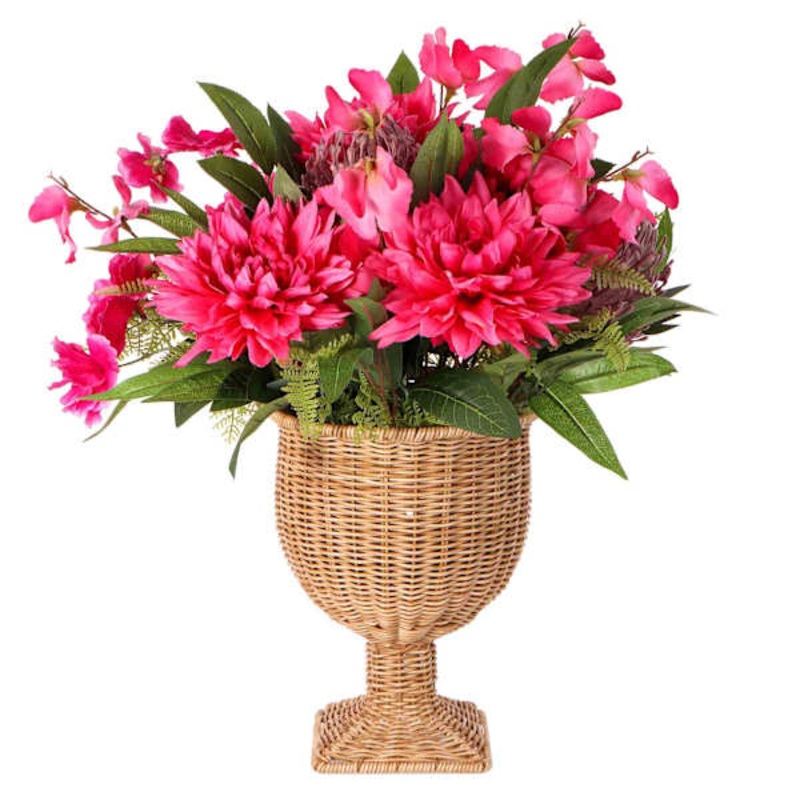 Brighten a dull corner of your room with a pop of everlasting bloom.Meet your new decor darling: this Pink Flower Arrangement in a lovely woven pot featuring an array of mixed blooms. Crafted from plastic, these flowers never fade and stay vibrant all year round. Perfect for adding a touch of color and nature to any room without the fuss of real plants.Each arrangement is thoughtfully curated to capture the beauty of nature with a playful twist. The woven pot adds a charming rustic touch, blending with almost any home decor style. This arrangement is perfect for tabletops, shelves, or even as a welcoming nod on the entryway console.Features a variety of mixed flowers for a natural look.Charming addition to any space. No maintenance required. Crafted from plastic.Dimensions12.0″ L x12.0″ W x20.0″ H Weight5.5 lbs.ColorpinkMaterialPlasticDepartmentStoreUPC197154374382Location ID42-SF03