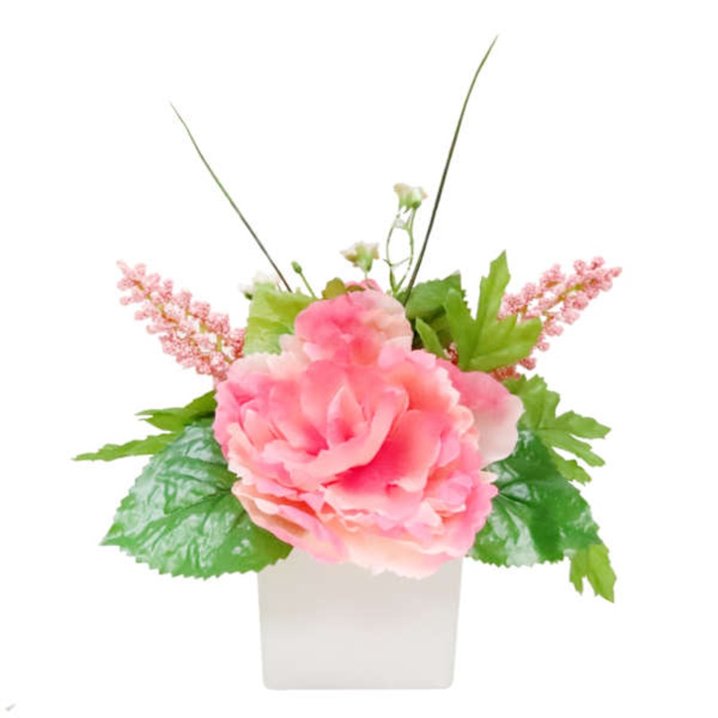 Arranged to impress.Add a touch of beauty to your space with the Pink Peony in Square Ceramic Pot.This artificial floral arrangement features lifelike pink peony blossoms bursting with color, perfectly complemented by lush green foliage. Whether displayed