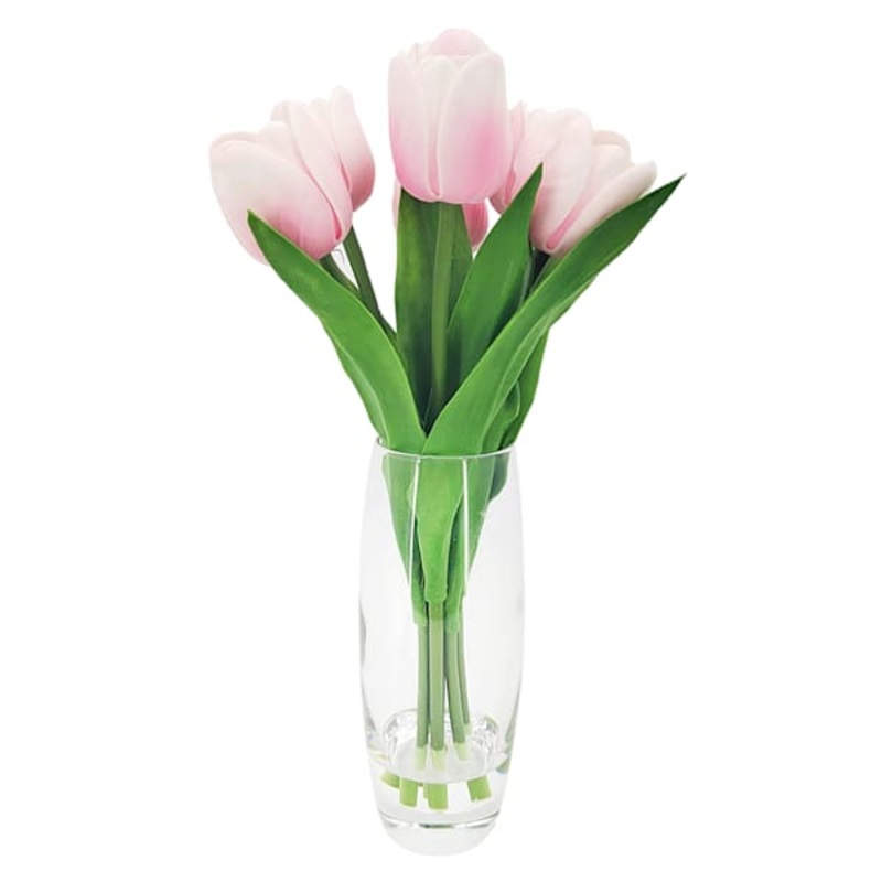 Bring the beauty of nature indoors Elevate your space with this stunning tulip arrangement in a glass vase. The lifelike petals and vibrant pink color mimic the appearance of fresh flowers, adding a touch of nature and a pop of color to any room. Unlike re