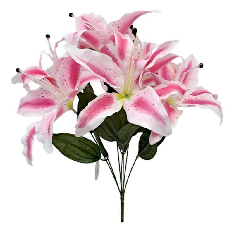 Our 19in. Pink Tiger Lily Bush is designed to add extra personality to your seasonal decorating. Spray bundles are for indoor use only. This wonderful pink, white and green artificial stem features wire throughout for shaping and long durability. Add to ga