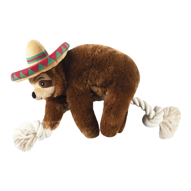 Give your furry friend something soft to play with when you toss them this rope toy with a plush stuffed sloth attached. The cute brown sloth is wearing a little sombrero and looks like he's hanging from the white rope. With its extra-loud squeaker inside,