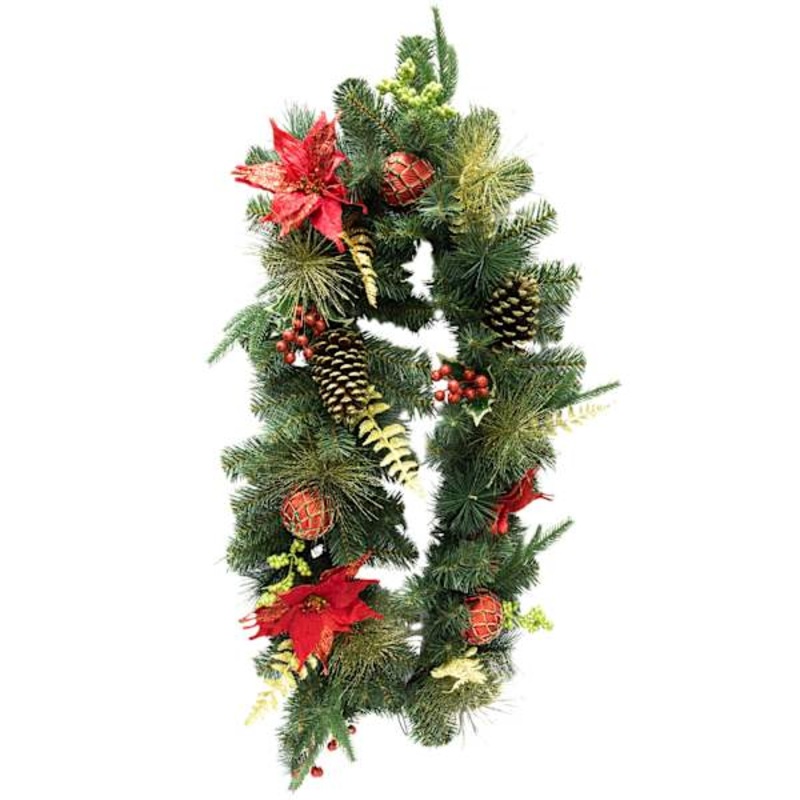 Bring classic holiday color to your home with this 6ft. red poinsettia Christmas garland accented with ornaments and pinecones. Lush faux greenery and velvety blooms create a full, festive look along a mantel, staircase or doorway. This swag drapes beautifully and bends to fit around banisters and frames. The red poinsettia detail pops against evergreen accents while the ornaments add a soft shimmer. Made of polyester for long-lasting color and easy care. Style one for a simple statement or layer two for extra impact in your seasonal decor.Dimensions10.0″ L x4.0″ W x72.0″ H Weight2.2 lbs.ColorredMaterialPolyesterDepartmentStoreUPC789112791241Location ID43-CF06A
