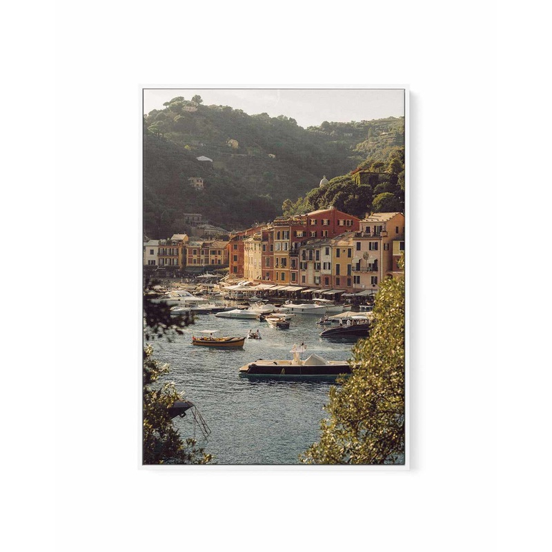 EXCLUSIVE to ! Transform your living space with 'Portofino 1970', a beautiful Italy travel photography framed canvas print featuring the beautiful coastline of Portofino on the Italian Riviera with terracotta buildings and boats on the sea. Perfect for any