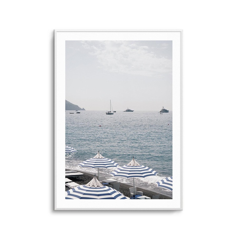 Bring the Mediterranean to your home with Renee Rae's Positano Umbrellas art print! This stunning photographic art print features the gorgeous Amalfi Coast in Italy, with sailboats in the horizon in the sparkling sea and striped blue & white umbrellas on t