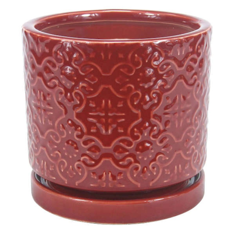 A collection that lets everyone relax in style. Polished finishes and classic hues pair with fun finds. Providence is where elegant settings still feel comfortable and warm-exclusively At Home. Highlight your green thumb and showcase your annuals and perennials at your front door or lend a pop of festive foliage to the deck with our 6in. Providence Indoor Pomegranate Ceramic Damask Planter. More than just a spot to display your gardening skills, this wonderful textured ceramic pot with built in drip tray offers a convenient display with its interesting shape. Designed to live indoors or in a covered outdoor space, it’s ready and waiting to make your plants pop.Dimensions5.9″ L x5.9″ W x5.1″ H Weight2.0 lbs.ColorredMaterialCeramicDepartmentPatioLocationOutdoor DcorUPC197154137444Location ID42-GL02A