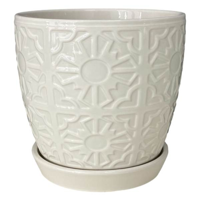 A collection that lets everyone relax in style. Polished finishes and classic hues pair with fun finds. Providence is where elegant settings still feel comfortable and warm-exclusively At Home. Highlight your green thumb and showcase your annuals and perennials at your front door or lend a pop of festive foliage to the deck with our 7.5in. Providence Indoor White Tile Print Planter with Saucer. More than just a spot to display your gardening skills, this wonderful sun tile design pot with built in drip tray offers a convenient display with its interesting shape. Designed to live indoors or in a covered outdoor space, it’s ready and waiting to make your plants pop.Dimensions7.5″ L x7.5″ W x7.3″ H Weight5.6 lbs.ColorwhiteMaterialCeramicDepartmentPatioLocationOutdoor DcorUPC197154137499Location ID42-TG03B
