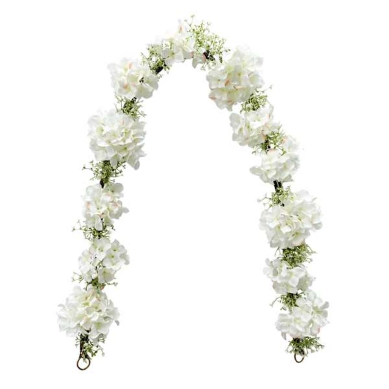 Adding a pinch of charm to your space has never been so lively!Introducing the Providence White Hydrangea & Baby’s Breath Garland-a blend of sophistication and charm crafted from fabric. This floral adornment is perfect for draping gracefully across mantels, winding around banisters, or making a statement at weddings and special events.The gentle white hue of hydrangeas pairs effortlessly with baby’s breath, creating a serene and sleek aesthetic that complements any style. Its lush, full design adds a layer of tranquility to any environment while requiring none of the upkeep of live flowers. Part of the Providence collection.Designed to emulate the alluring beauty of real flowers. Perfect for celebrations, daily decor, or as a thoughtful gift idea. Crafted from fabric.Dimensions4.0″ L x5.0″ W x72.0″ H Weight1.8 lbs.ColorwhiteMaterialFabricDepartmentStoreUPC197154376188Location ID42-SF02