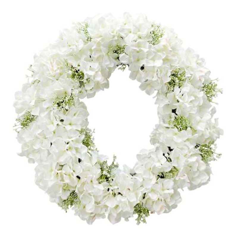 Transform any space into a serene floral escape!This charming wreath showcases elegance, white hydrangea intertwined with sprigs of baby's breath. Made from fabric, it's crafted to replicate the eDimensions24.0" L x24.0" W x5.0" H Weight2.1 lbs.ColorwhiteM