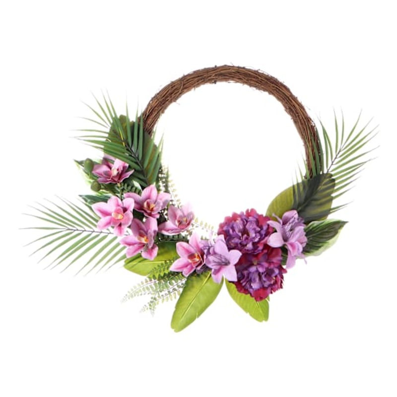 Spruce up your doorway with a splash of exotic beauty!The Purple Flowers Half Wreath offers a delightful pop of color that’s bound to enchant anyone who crosses its path. With its lush purple flowers, this wreath embraces the charm and brings it straight to your door. Whether you’re welcoming guests or looking to brighten up your space, this wreath promises a vibrance to any setting.Crafted from plastic, this wreath ensuring that the hues remain spectacular throughout the seasons. Its tropical greenery design adds a touch of the exotic, making it a perfect statement piece for any occasion. Ideal for outdoor and indoor use, requires zero maintenance while maintaining its eye-catching allure. Vibrant tropical greenery design with lush purple blooms. Perfect for both indoor and outdoor decoration. Brings tropical charm to your home effortlessly. Crafted from plastic.Dimensions22.5″ L x22.5″ W x6.0″ H Weight0.9 lbs.ColorpurpleMaterialPlasticDepartmentStoreUPC197154374139Location ID42-SF04C