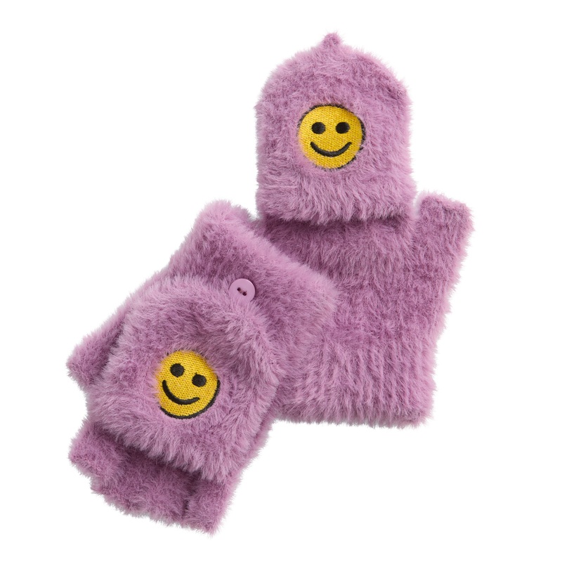Designed with an embroidered yellow smiley face, our purple two-way eyelash-knit gloves are a cheerful accessory for chilly days. Wear them as mittens or fold the pockets over to use them as fingerless gloves. A World Market bestseller, this versatile acce