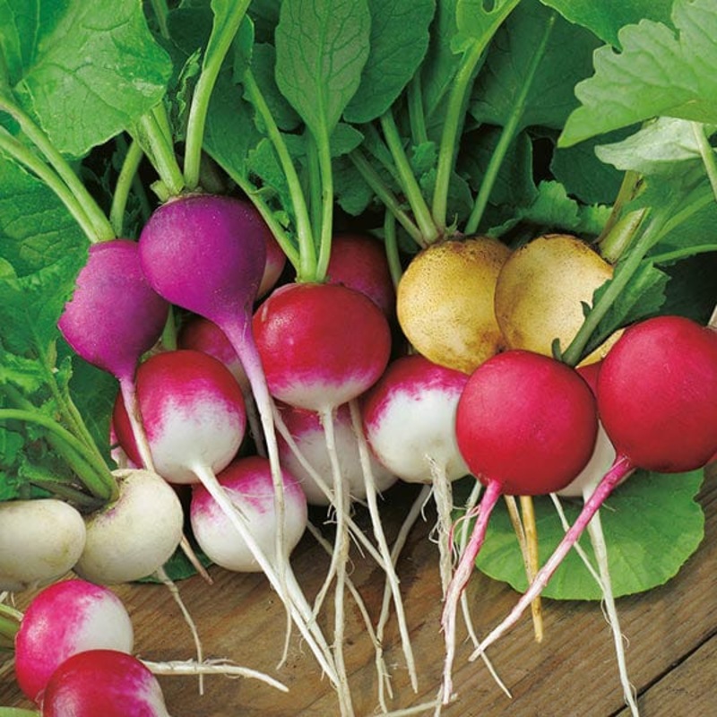 Brighten up the salad bowl with this mix of crisp and tasty, spherical radishes. For an extra wow factor they vary from red and white to purple and yellow! An excellent source of vitamin C. Easy to grown between slow maturing crops or in pots.