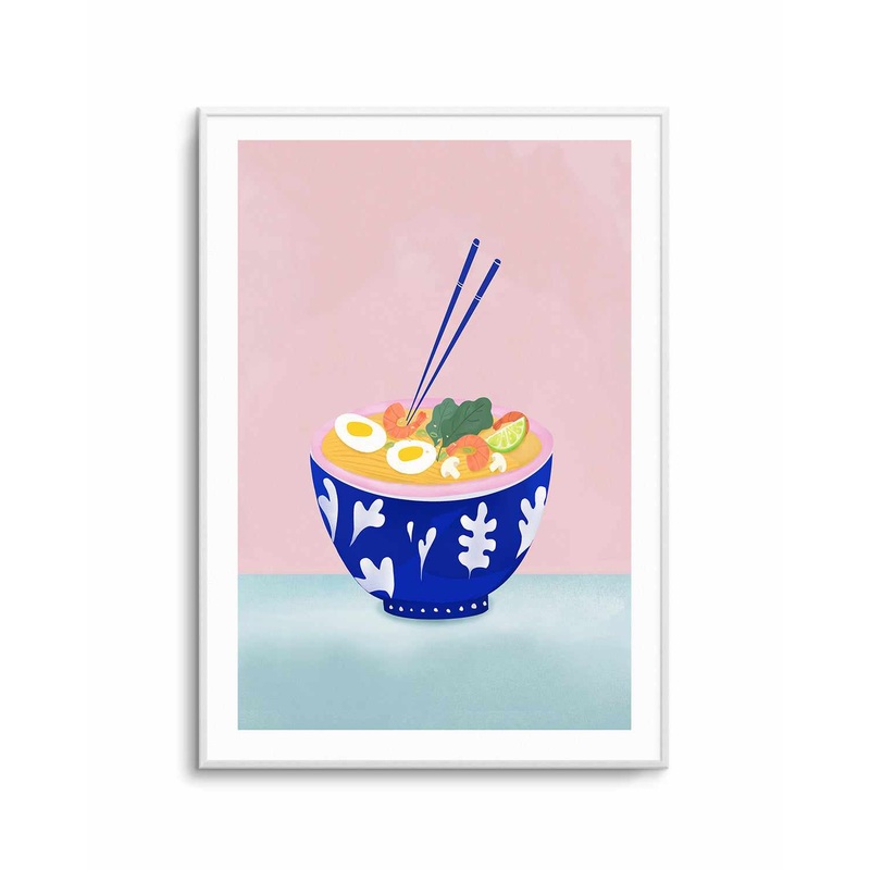Add some colour and personality to your living space with 'Ramen Bowl' by Petra Lizde, a vibrant modern illustration wall art print featuring a gorgeous blue bowl of ramen with a blush pink backgroundPerfect for any living room, dining room, bedroom or hom