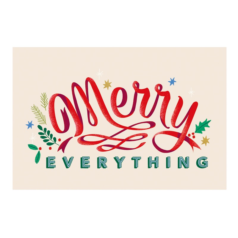 Send a bright holiday message with this set of boxed cards that reads “Merry Everything” on the front with a warm wish inside. The colorful greeting with illustrations of holly and accented with gold foil is a festive way to spread joy and mirth with everyone on your list this holiday season.