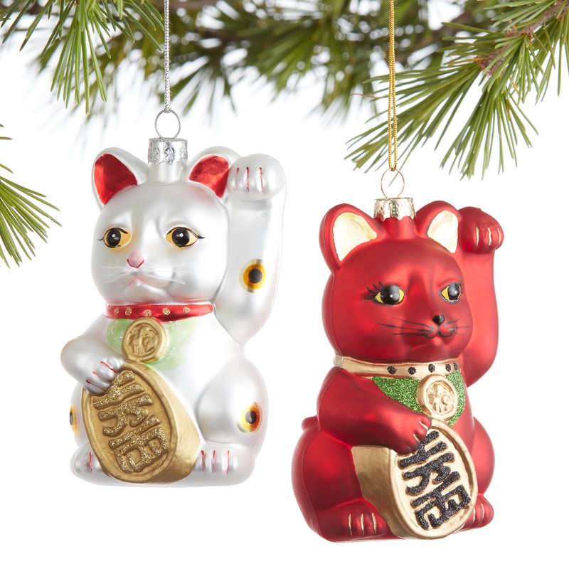 Invite good luck this holiday season with our Christmas ornament duo depicting the maneki-neko, or beckoning cat. An iconic, auspicious symbol found all over Asia, this set of two lucky cats in red and white each hold a wish for “good fortune” in Mandarin.