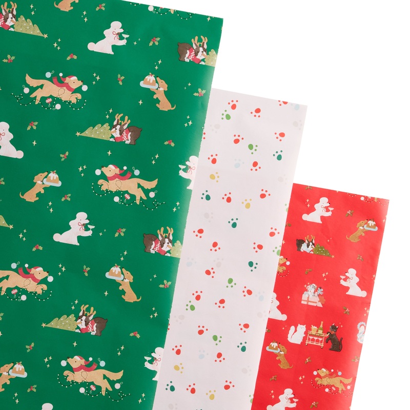 Add a dash of holiday fun to your gifts with this 3-pack of pet-themed wrapping paper rolls. Featuring cheerful illustrations of playful pups and Christmassy cats in red, green and white, this set offers a delightful mix of designs that capture the joy of