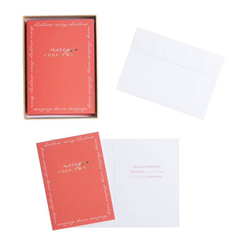 Spread holiday cheer with this set of boxed Christmas cards featuring a warm message inside. Each card has a white-script frame of Merry Christmases surrounding a white and gold Merry Christmas greeting. The deep red background runs edge to edge and is dot