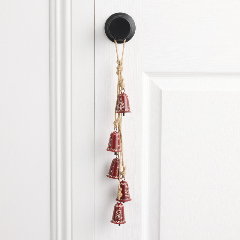 Ring in the season in bright global style with our metal-and-jute hanging decor from India. A cluster of five red bells, each hand painted with festive winter designs and knotted with heavy rope, it brings rustic beauty and merry jingle to your mantel, doo