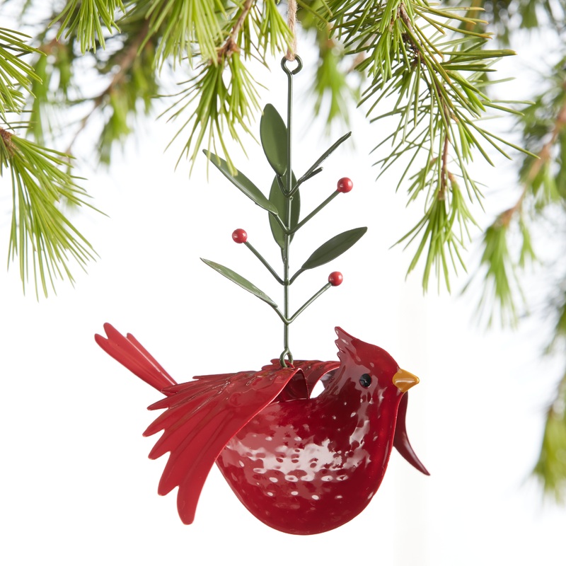 Fashioned from metal and finished in glossy red, this colorful ornament brightens any Christmas decor. An open-winged cardinal hanging from a berry-studded sprig of greenery, it welcomes the holiday season with bold, dimensional beauty.