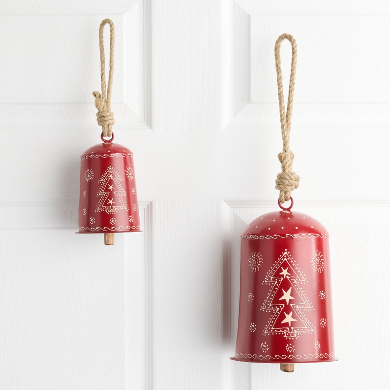 Ring in the season in bright global style with our iron bell hanging decor from India, available in two generous sizes. Painted red, hand detailed with festive Christmas trees and winter designs, and hanging from a jute rope, it brings rustic beauty and me
