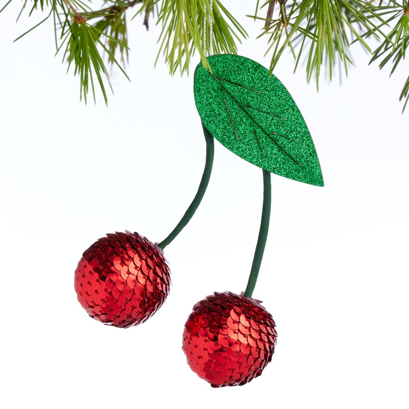 Sweet, tart and simply charming, our dazzling duo of cherry ornaments brings a taste of summer to your winter decor. Each tiny round fruit is covered in bright red sequins and topped with a green paper stem and glittering leaf.
