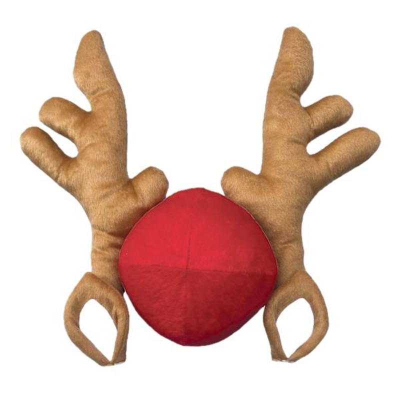 Turn your ride into a cheerful reindeer in minutes. This fabric Reindeer Car Kit includes two plush antlers that secure over the windows and a bright red nose that fastens to the front grille. The soft material feels cozy and keeps its shape while staying
