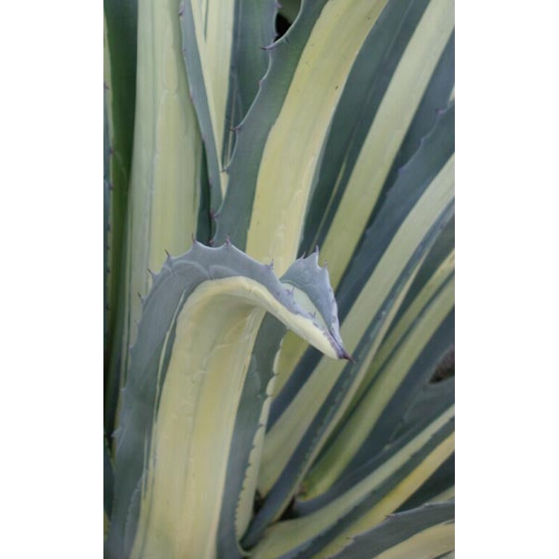 Beautifully variegated, with rosettes of beautifully curved leaves colored a dusty blue-green with a wide creamy stripe in the center. Grows to 5ft by 5ft, eventually. Slowly offsets in bright light and well-drained soil with occasional summer water but lovely as a single plant. As luck would have it, this form is hardier to frost than many, with plants surviving 10 to 15F, USDA zone 8, in soil that is dry in winter. Pull inside or cover below 20F or so in areas of winter wet.