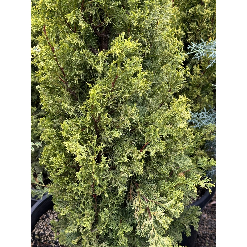 Fabulous form of the Italian cypress, to 15 ft or more, with bright yellow-dusted-blue-green foliage. Like its cohorts, very drought tolerant. We use it in our garden as an accent surrounded by lots of blue and dark green foliage. it's been around for awhi