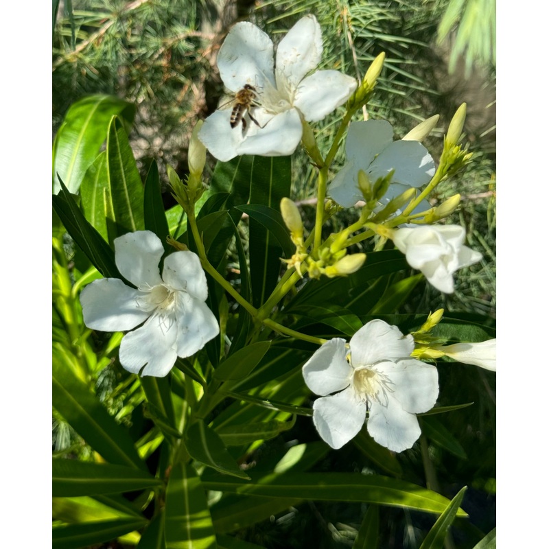 Fast-growing evergreen shrub with simple white flowers and narrow, leathery, semi-glossy leaves. Oleanders in general like hot, dry summers and mild winters (Mediterranean) and this one is no exception. A vigorous cultivar, 'Sister Agnes' can grow to 15-20