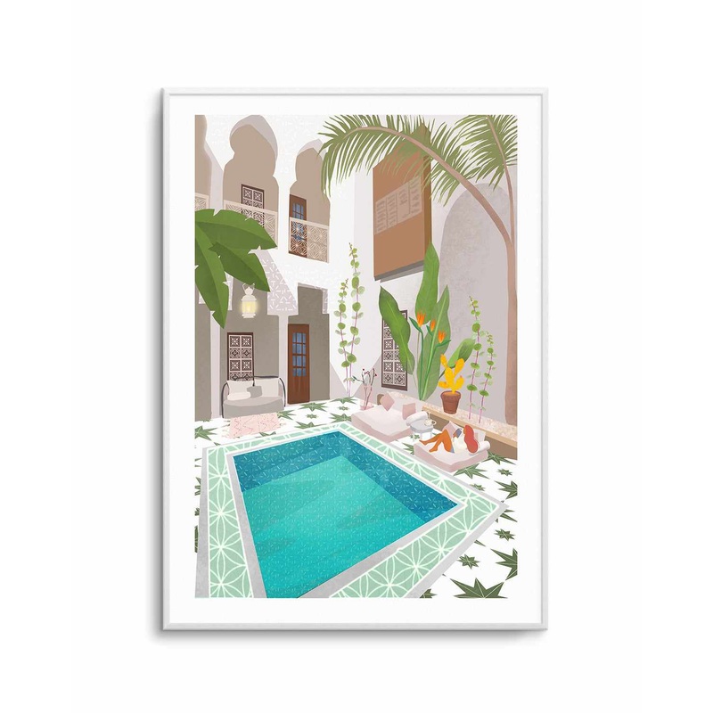 Add some colour and personality to your living space with ‘Riad’ by Petra Lizde, a vibrant modern illustration wall art print featuring a pretty Moroccan courtyard with an inviting aqua pool. Perfect for any living room, dining room, bedroom or home office after a modern aesthetic. So if youre looking for an easy way to bring some modern styling into your home then this high quality artwork is just the thing you need!