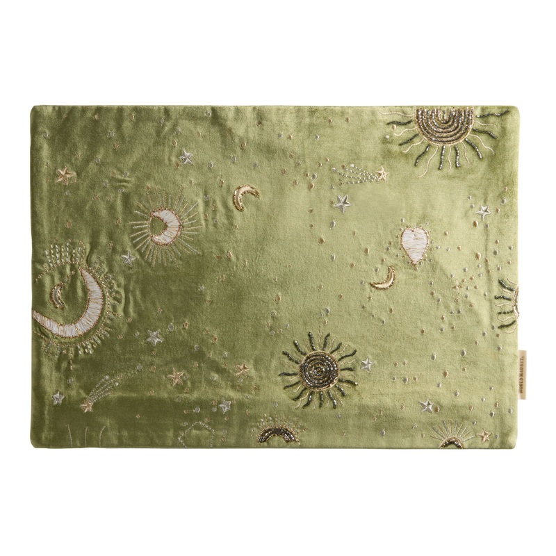 Mystical winter meets velvety ’90s vibes in our exclusive sage-green lumbar pillow cover, starring embroidered celestial motifs. Moons, suns and stars are embroidered in gold and ivory metallic yarn on velvet for a shimmery accent to your home decor.