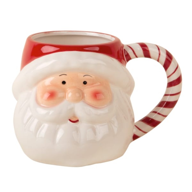 Bring festive cheer to your Christmas kitchen with the 16oz. Santa Candy Cane Mug, 16oz. The sculpted Santa face and candy cane striped handle in vivid red and white ceramic create a playful holiday accent that stands out on any shelf. The comfortable handle and sturdy ceramic build make it a favorite for cozy routines and cheerful decor. A charming gift and a merry addition to any Santa mug or holiday mug collection.