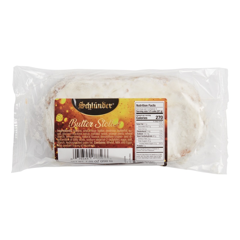 In the spirit of a 125-year tradition, Schlunder stollen is crafted with a classic yeast dough filled with raisins and bits of candied lemon and orange, then dusted with sugar. A soft, sweet holiday treat, this confection has a delicious buttery flavor and
