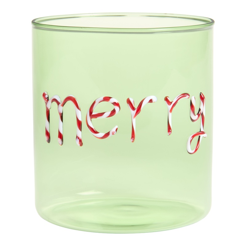 Made of straight-sided borosilicate glass adorned with hand-applied text, our large double old-fashioned glass charms with a simple, seasonal sentiment. This collectible home-bar essential is available in a choice of Christmas-inspired phrases in a red and