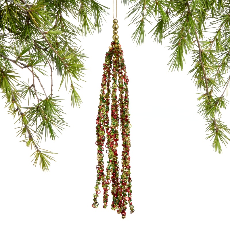 Sumptuous, sparkly and festive as can be, this handcrafted tassel features a gorgeous mix of sequins, beads and gems. In Christmassy shades of gold, red and green, it lends classic style and holiday dazzle to tree branches or gifts.