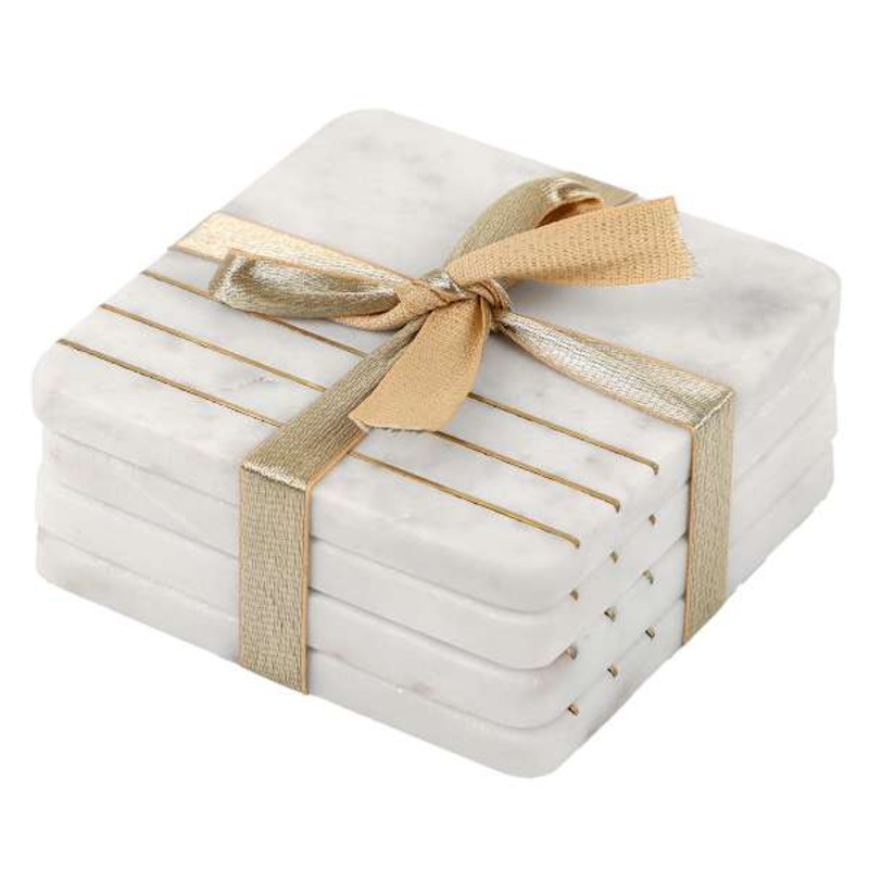 Introducing our Set of 4 Marble and Brass Inlayed Coasters – a stylish and practical touch for any home decor. These charming coasters feature a striped design that adds personality to your living space. Crafted with a sturdy and wipeable construction, they are the perfect companions for all your favorite beverages. Elevate your hosting skills and protect your furniture effortlessly with our brass and marble coasters. Say goodbye to unwanted condensation rings and hello to joyful conversations filled with laughter and cheer – because after all, moments are made of such details.Dimensions4.0″ L x4.0″ W x0.4″ H Weight3.0 lbs.ColorwhiteMaterialWoodDepartmentHousewaresUPC197154335475Location ID49-11