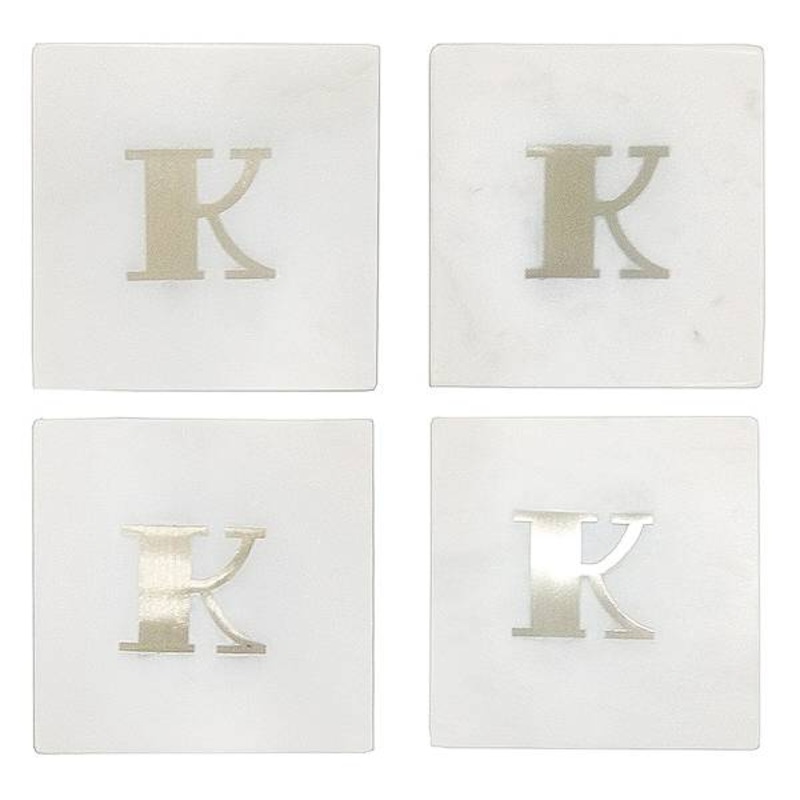 Protect your surfaces in style.Say goodbye to unsightly drink rings with these charming monogram “K” coasters. Crafted with a sleek marble and brass finish, they effortlessly elevate any setting.Showcasing modern design elements, these monogram coasters seamlessly blend functionality and fashion. The combination of durable marble and brass ensures long-lasting performance, making them perfect for everyday use or special occasions.Elevate your decor with these stylish marble and brass coasters.Combining fashion and function, they protect your surfaces from drink rings.Crafted from quality marble and brass, these coasters are built to last.Personalized monogram “K” design.Set of 4 coasters included.Measures 4in. L 0.5 in. W 0.5in. H.Dimensions4.0″ L x4.0″ W x0.4″ H Weight3.2 lbs.ColorwhiteMaterialStonewareShapeSquareDepartmentHousewaresUPC191607478559Location ID49-CLRNCE