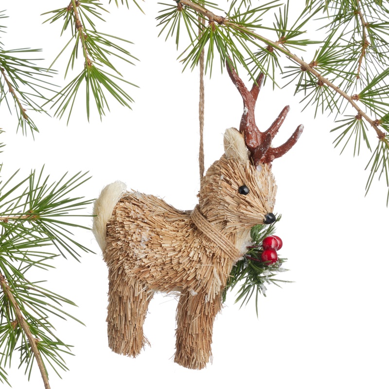 Finely fashioned of natural fiber with a dimensional texture, our rustic sisal deer ornament arrives to your holiday home dusted with snowy flocking. This timeless woodland animal decoration is detailed with brown antlers and carries a faux pine and red berry in wreath in its mouth for a bright touch of festive seasonal color.