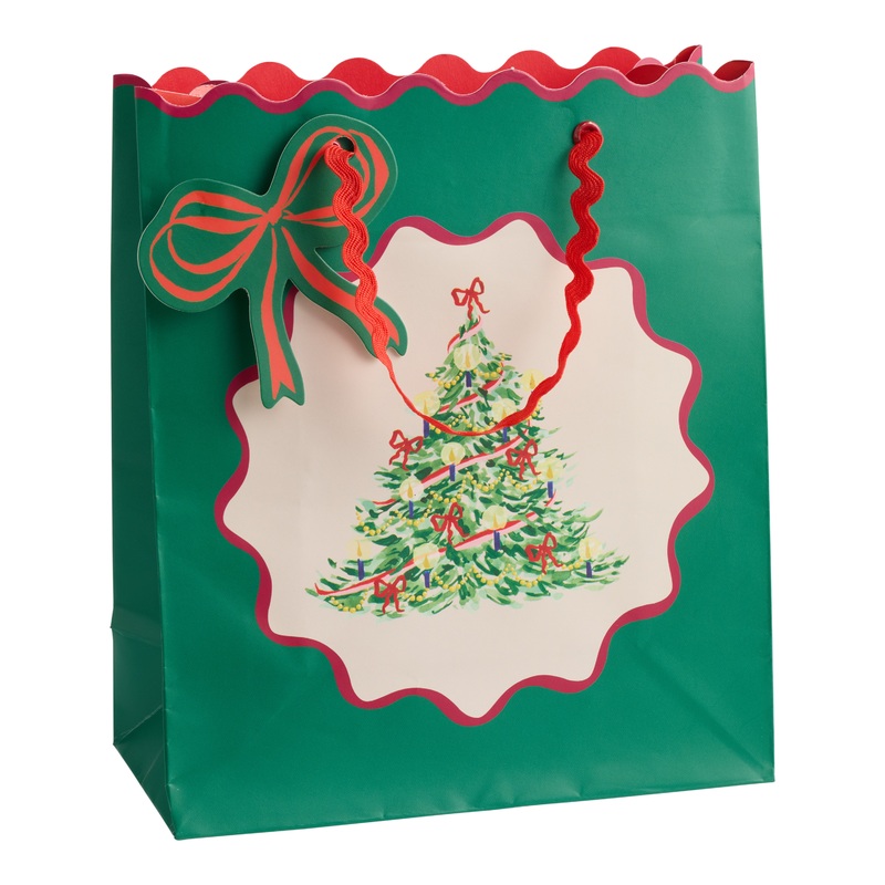 Add a touch of festive flair to your gifts with our small Christmas tree gift bag. The die-cut scalloped top and rickrack ribbon handles give it a charming, vintage feel, while the beautifully decorated Christmas tree adds classic holiday cheer. Perfect for small gifts that deserve special presentation, it includes a coordinating bow-shaped gift tag.