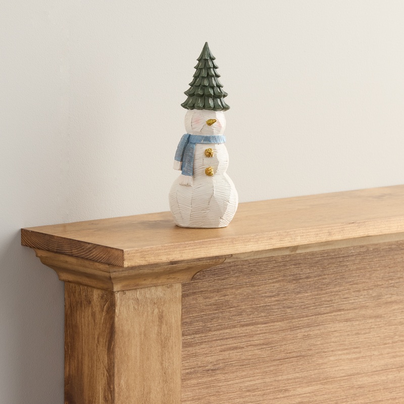 Intricately molded from resin to resemble carved wood, this rustic snowman figure wears a dusty-blue scarf and an evergreen tree as a hat. Tall, textural, and fitted with gold pinecone buttons and a glittering carrot nose, it makes a wintry statement where