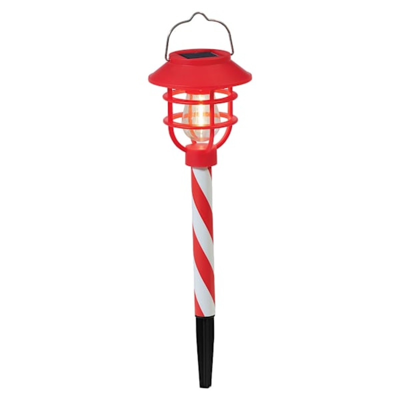 Add a cheerful glow to your walkway with this solar cage stake light. A bold red cage frames a playful striped swirl accent, creating a festive focal point by day and a soft shine after dark. The built-in solar panel charges in sunlight, so there are no cords or batteries to manage. Crafted from plastic and sized at 16in. tall, it tucks neatly into planters, garden beds, or along paths. Simply stake it in and enjoy nightly sparkle with zero effort.