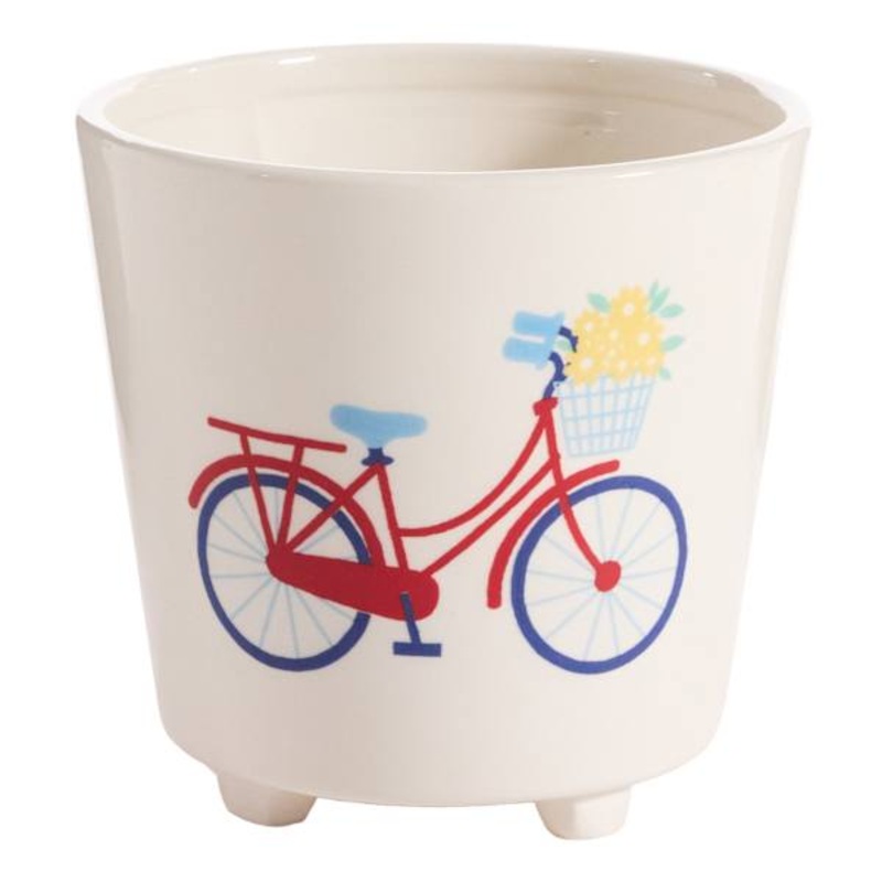 Highlight your green thumb and showcase your annuals and perennials at your front door or lend a pop of festive foliage to the deck with our 6in. Sunny Club Indoor Bicycle Print Planter. More than just a spot to display your gardening skills, this wonderful white and colorful bicycle print ceramic pot offers a convenient display with its interesting shape. Designed to live indoors or in a covered outdoor space, it’s ready and waiting to make your plants pop.Dimensions6.1″ L x6.1″ W x5.9″ H Weight2.0 lbs.ColorwhiteMaterialCeramicDepartmentPatioLocationOutdoor DcorUPC197154351956Location ID42-TG04A