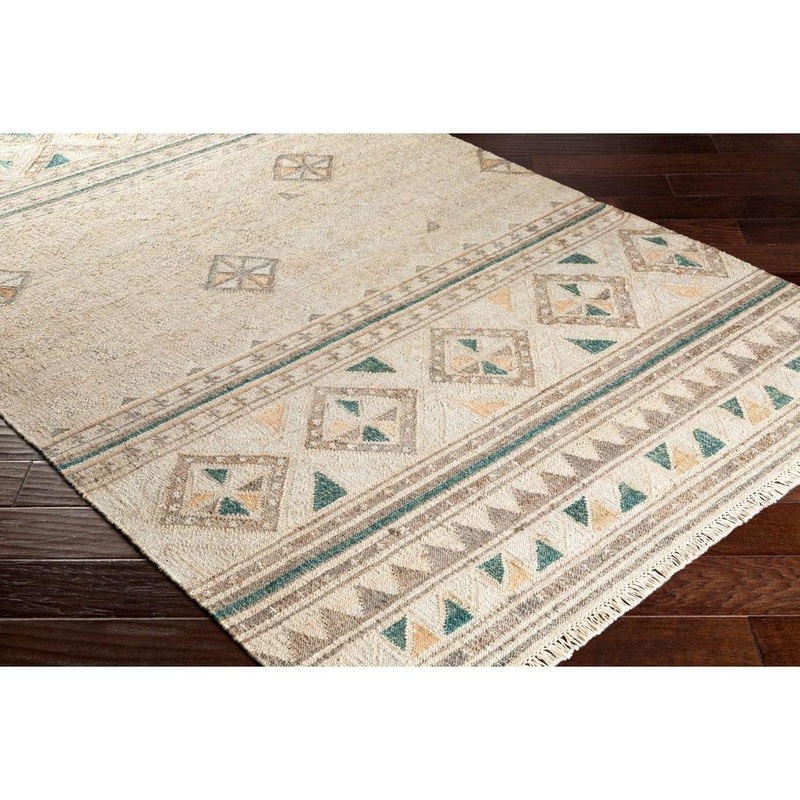 Beautiful and chic, this Pioche area rug from The Curated Nomad will lend contemporary style to your decor. The hand-woven rug is made from jute, and features a diamond and triangle pattern with a stripe border. The elegant rug is available in your choice of khaki, beige, or tan.