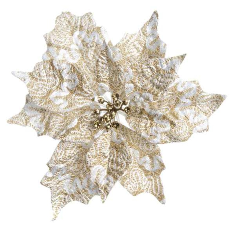 White & Gold Lace Poinsettia Clip Ornament, 9″