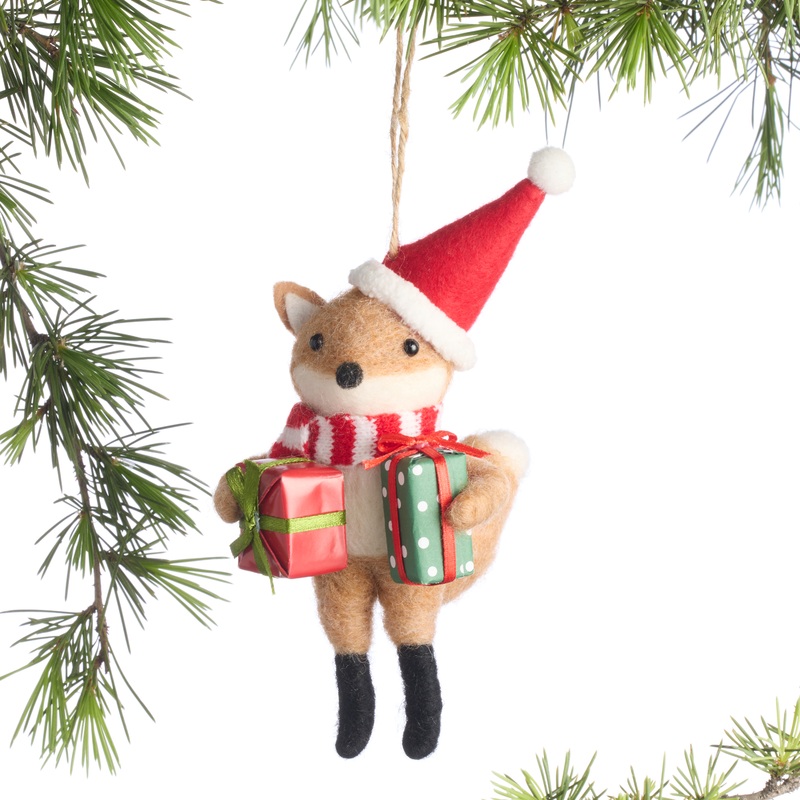 Handcrafted from fuzzy lambswool, our foxy forest dweller sports a red Santa hat, a candy cane-striped knit scarf, and a pair of bright paper-wrapped gifts. Bushy tailed and black booted, this adorable ornament is full of festive style and woodland warmth.